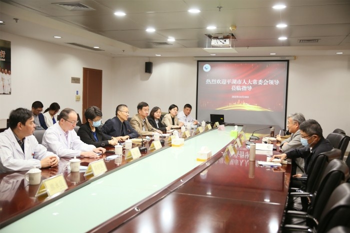 市人大常委会副主任阮岳军、教科文卫民宗侨外工委主任吴建平、市卫生健康局副局长、党委副书记钱瑛、院党委书记陈锋、院长陈利群等人陪同下,平湖代表团一行参观了我院医共体服务中心、门诊服务中心、急诊抢救室、云急救中心、放射影像科、新健康管理中心等,了解相关工作开展情况。